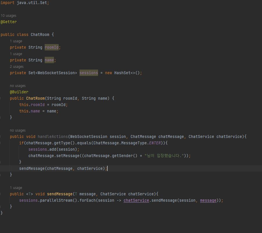 WebSocketSession 정보 리스트를 멤버 필드로 갖습니다.