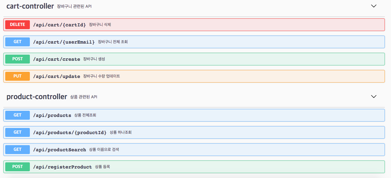 저의 장바구니 컨트롤러에 swagger를 적용시킨 모습입니다.