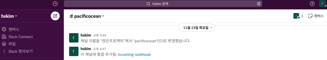 slack에 가입 후 채널 추가를 통해 저의 프로젝트를 채널로 추가합니다.