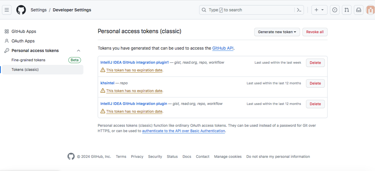 settings -> developer settings -> tokens 에서 새로운 토큰을 생성해주고 해당 토큰을 계속 사용할 수 있습니다.