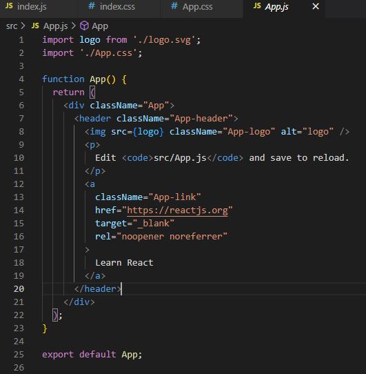 이번에는 App.js에 들어와서 import logo from './logo.svg'; 와 <div className="App"> 태그 안에 있는 코드를 지워줍니다.