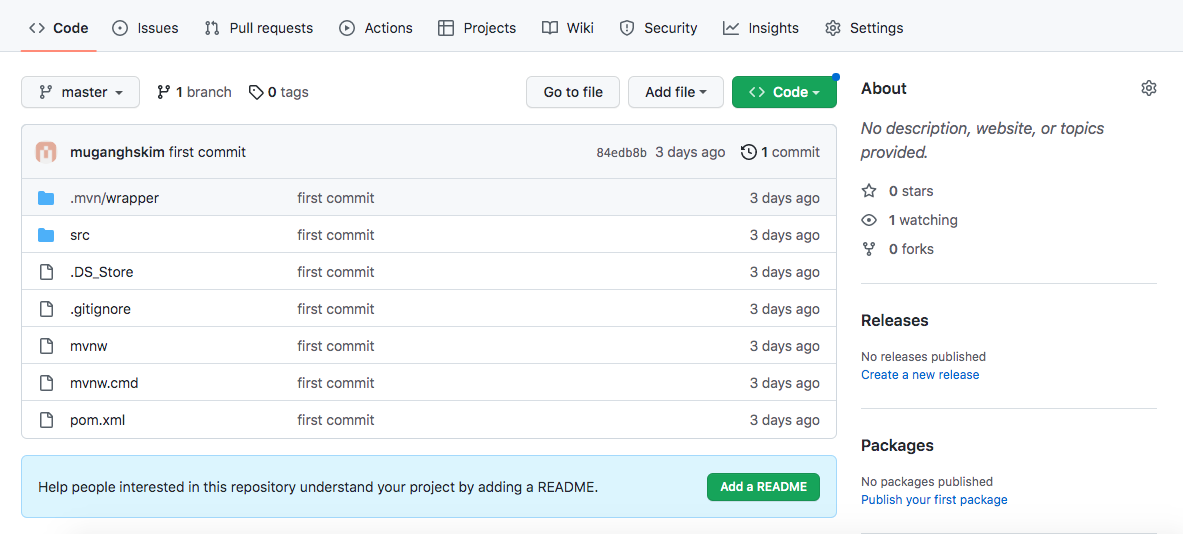 레파지토리를 만들게 되면 다음과 같은 창이 나옵니다.